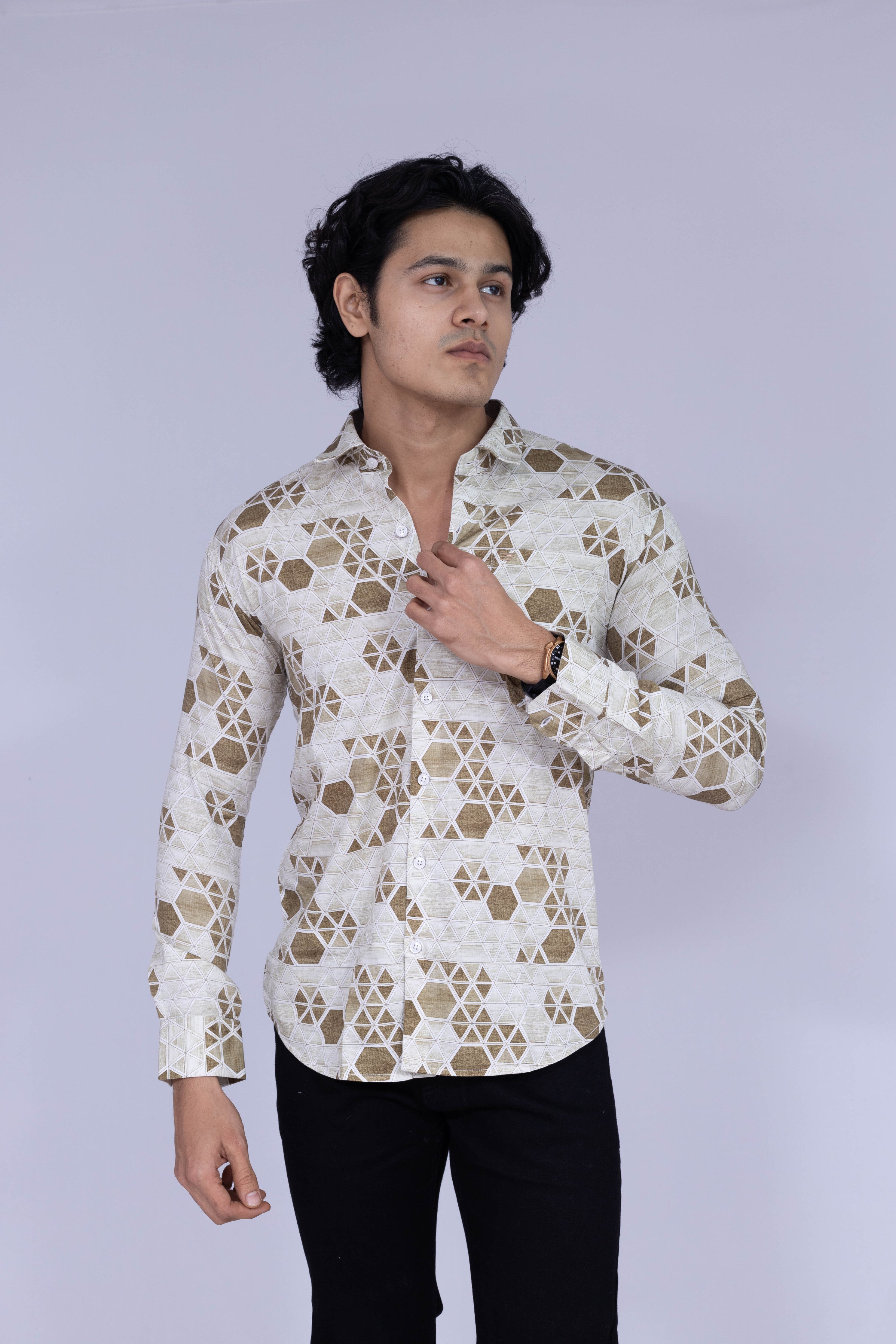 This shirt is a perfect blend of sophistication and contemporary design, featuring a unique hexagon print in a rich ocher color. The combination of the striking pattern and the warm ocher hue adds a touch of elegance to your attire.