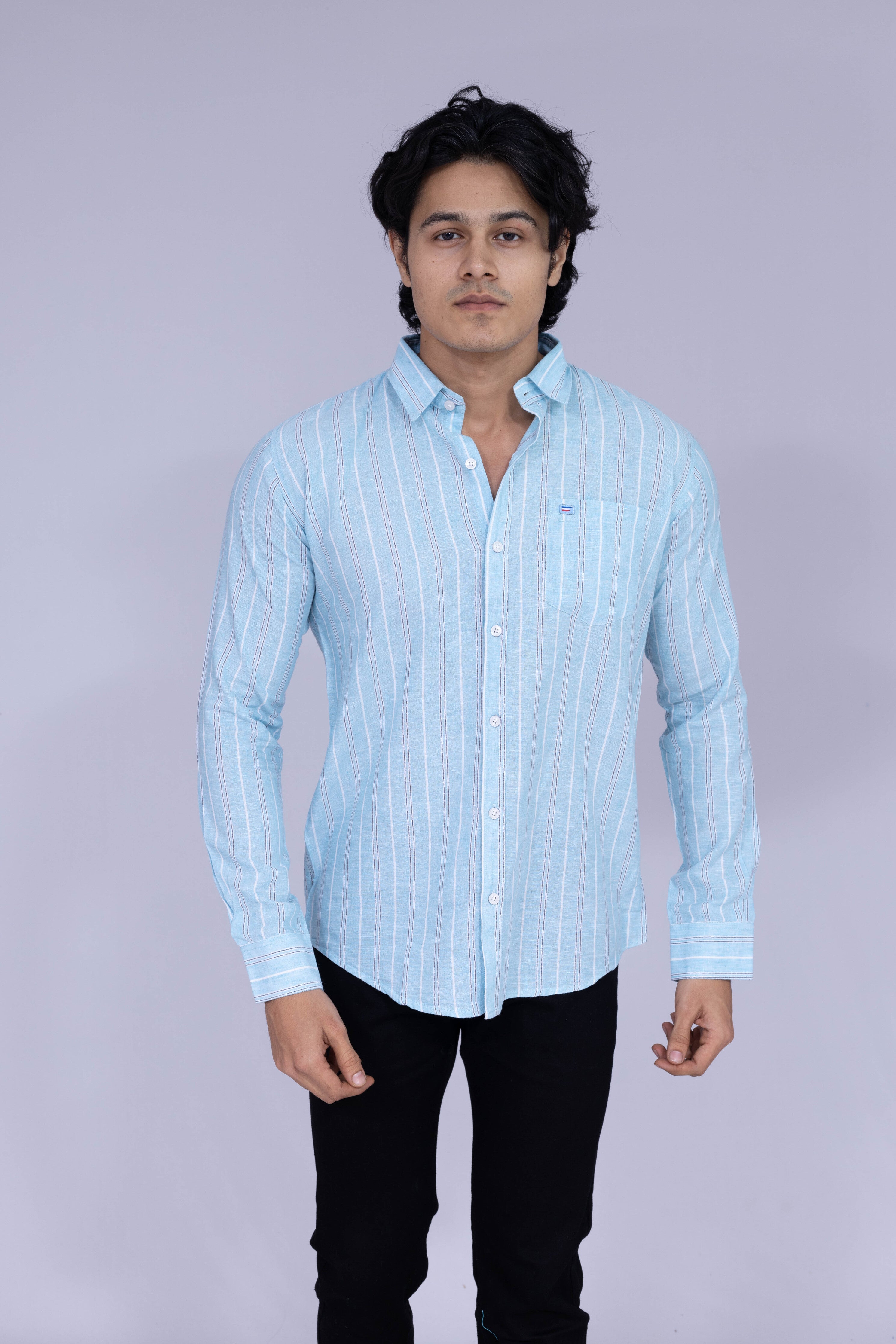 Step into sophistication with this men's light blue shirt featuring bold double vertical stripes in red and white. The light blue base provides a fresh and crisp backdrop, while the dual stripes add a striking and modern touch.