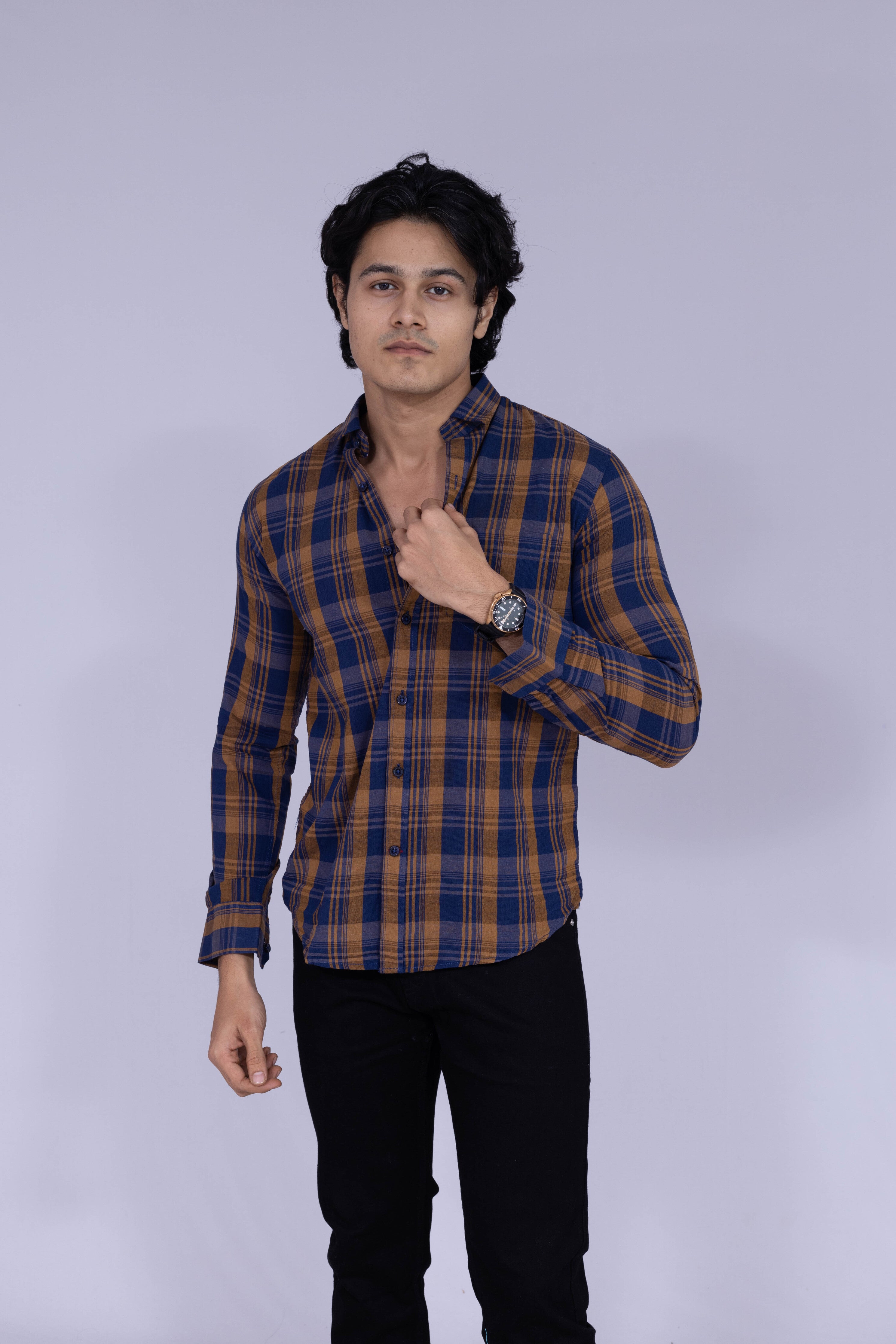 Infuse your wardrobe with a touch of warmth and style with this ocher and blue checked shirt. The earthy ocher tones paired with cool blue create a harmonious and visually appealing pattern.