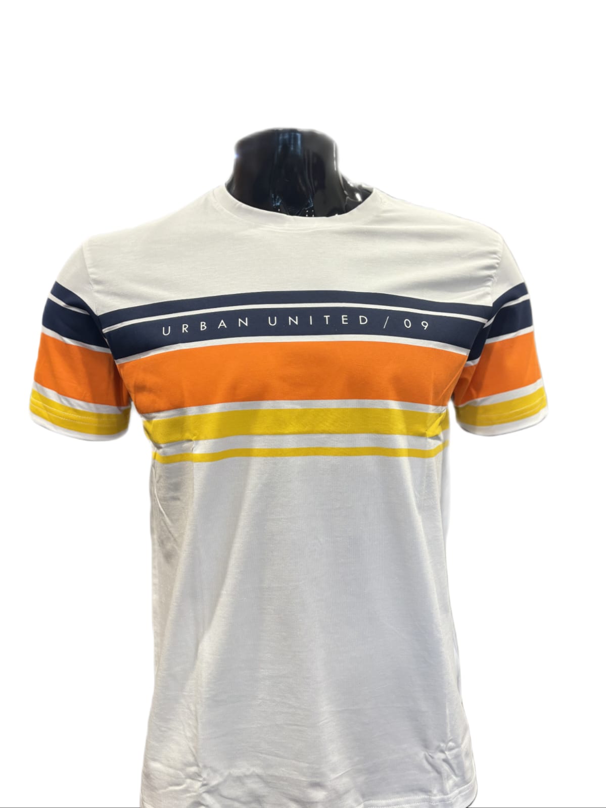 "A stylish round neck T-shirt featuring a vibrant print in white, yellow, and blue, ideal for adding a pop of color to your wardrobe."
