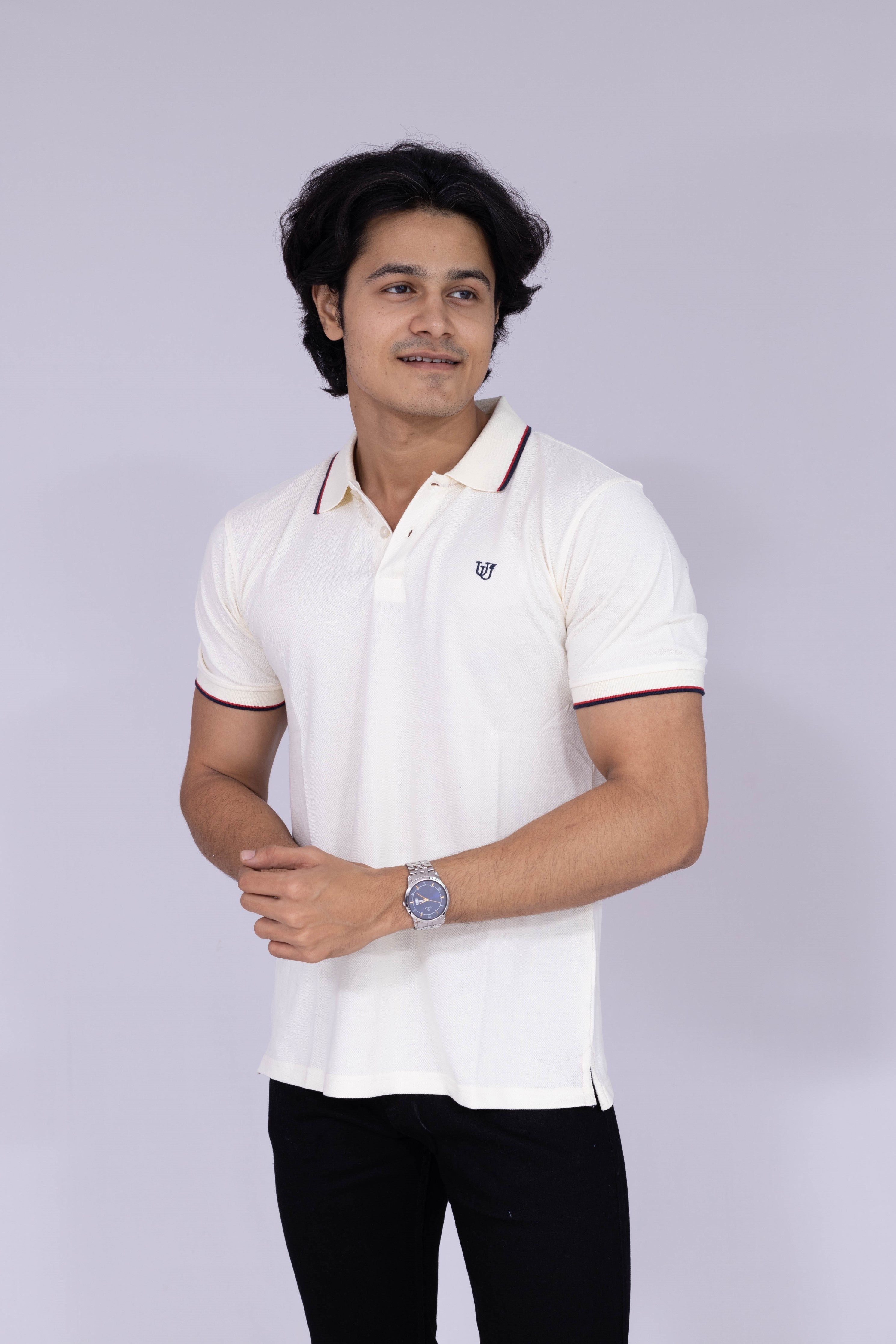 The "White Polo T-Shirt with Maroon Details" is a refined and versatile addition to your wardrobe, designed for those with a taste for timeless fashion. Crafted from a premium cotton blend, it offers a luxuriously soft and comfortable feel against your skin. The classic white base is elegantly complemented by subtle maroon details